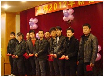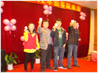 聯歡會上,首先由公司總經理潘曉亭致詞,先是對公司2011年總體工作做了總結報告,并回顧了過去一年來的辛勤工作以及取得的良好業績,同時也為大家描繪了公司在新的一年里美好規劃藍圖。之后,公司領導為大家送上了節日的問候。周振華廠長為表現突出的生產部員工頒發了優秀員工獎(共10名)、勤奮獎(共6名)、全勤獎(共3名)。現場氣氛更是熱烈,同時也擺上了晚宴,最讓人期待的更是抽獎環節。大家在聽到總經理宣布抽獎時,現場氣氛更是一度高漲,一些員工更是壓抑不住自己的激動心情,一片歡呼。隨后大家按照規則每人抽取一張牌,最后由總經理宣布三等獎(共24名)、二等獎(共8名)、一等獎(共4名),并頒發獎金。在接近頒獎尾聲,聯歡會也漸漸地圓滿的落下了帷幕。