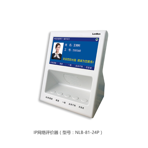 IP網絡評價器(型號:NLB-81-24P),采用5英寸數字真彩屏,按鍵式操作,置于窗口外,供顧客使用;