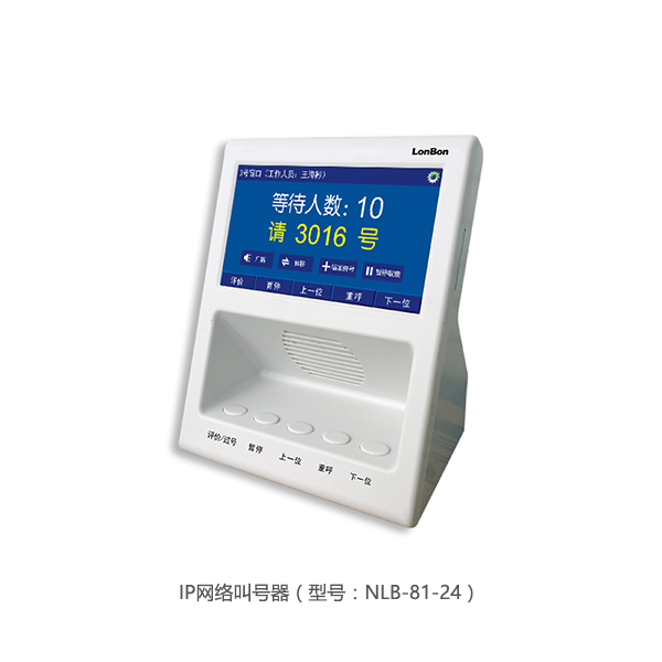 IP網絡叫號器(型號:NLB-81-24)采用5英寸數字真彩屏,按鍵式操作,置于窗口內,供工作人員使用。