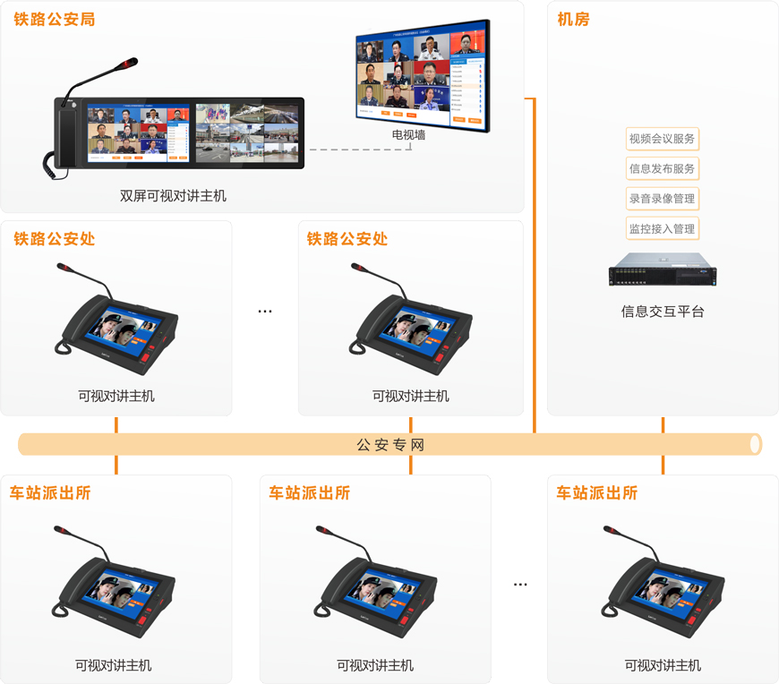 鐵路公安部門工作所涉及的范圍越來越廣,執法工作量日益增加,公眾對鐵路公安部門的工作效率、反應及應變能力等提出了更高的要求。同時,各機關之間地理跨度較遠,日常勤務溝通較頻繁,需建立一套“局--處--所”三級架構互聯互通的“音視訊”通訊指揮系統,實現及時便捷的溝通交流,提升鐵路公安局、鐵路公安處、車站派出所之間日常溝通效率和應急處置能力。